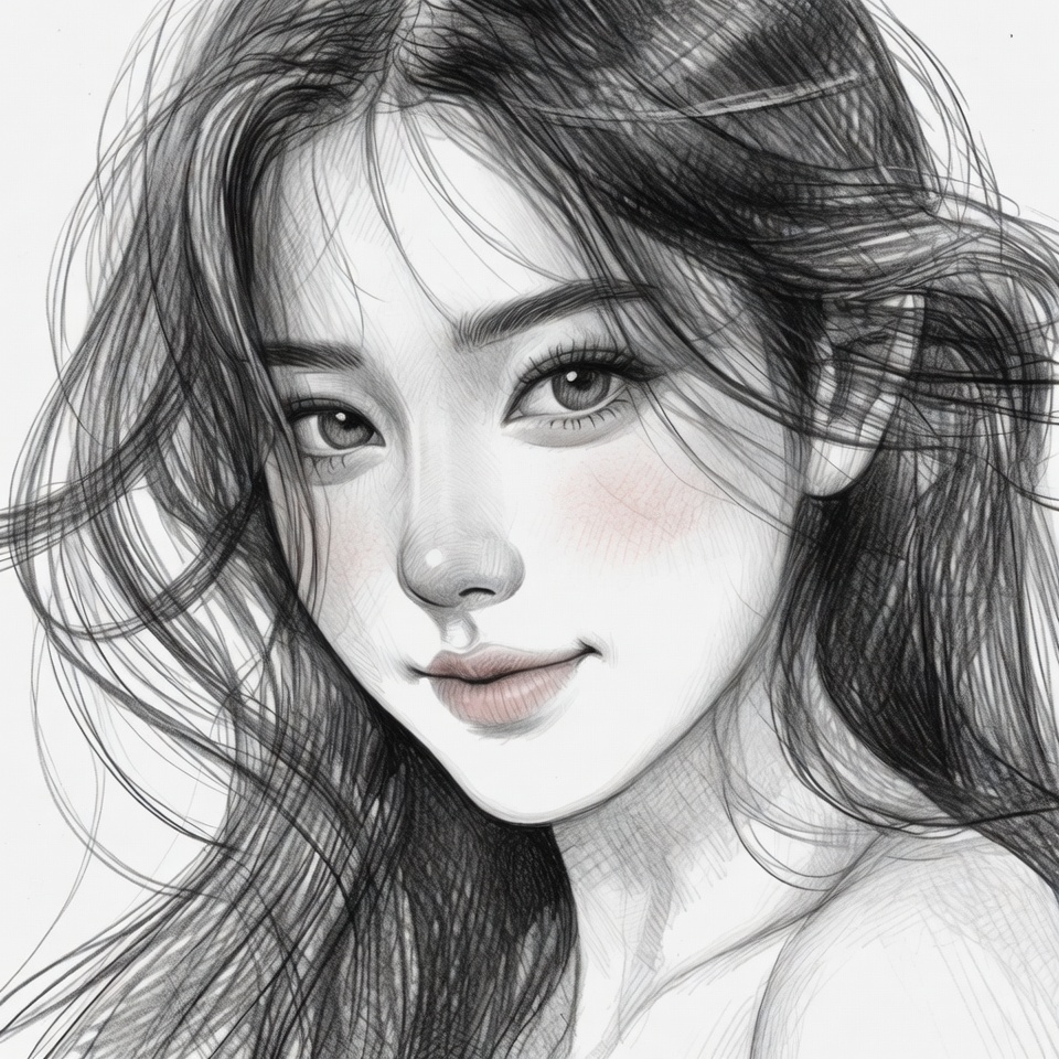 A detailed digital illustration of a young Asian woman with long flowing black hair and expressive eyes. She has soft pink blush on her cheeks and a gentle smile on her lips. The portrait features intricate line work and shading on an isolated white background.