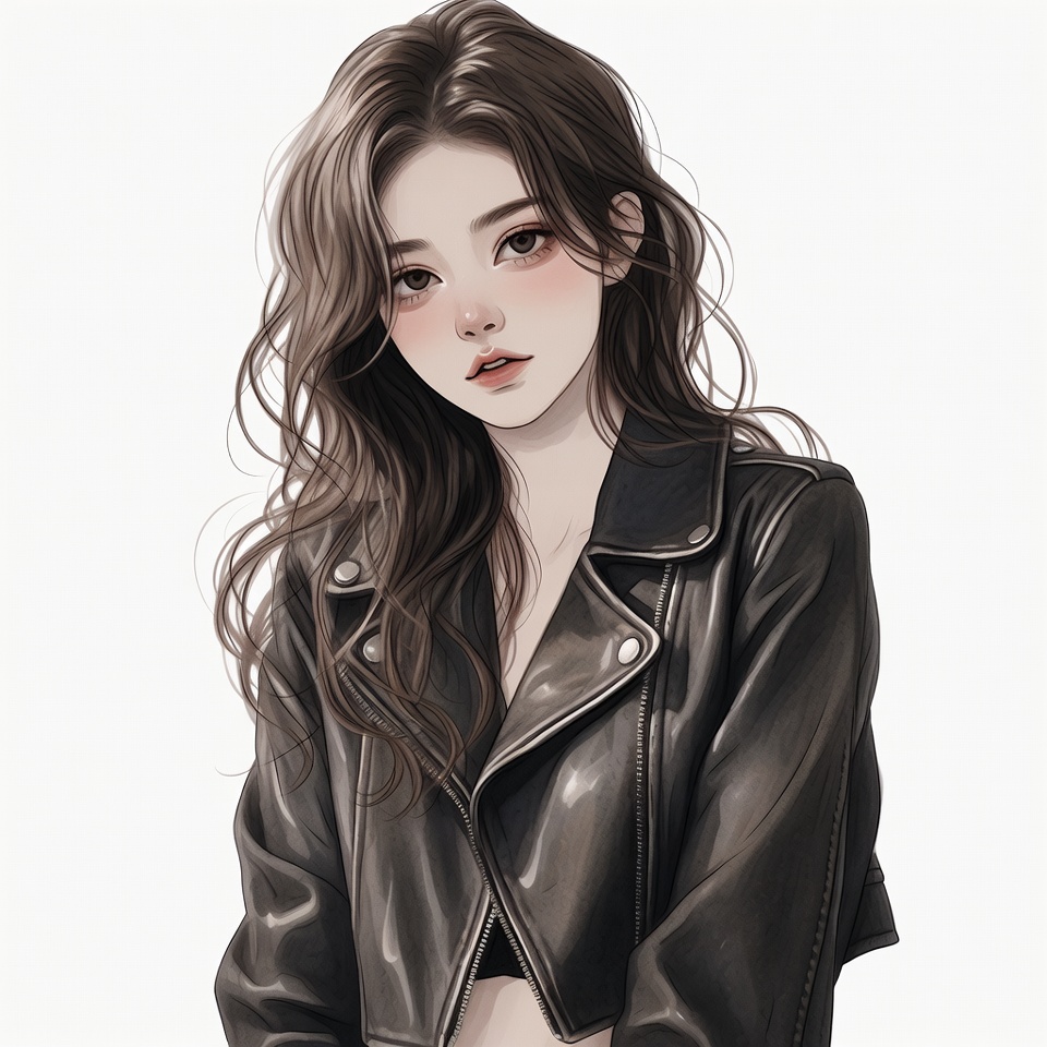 A young Asian woman with long wavy brown hair gazes forward with a subtle smile. She wears a black leather jacket with silver zippers over a black top. The digital illustration features her on a plain white background.