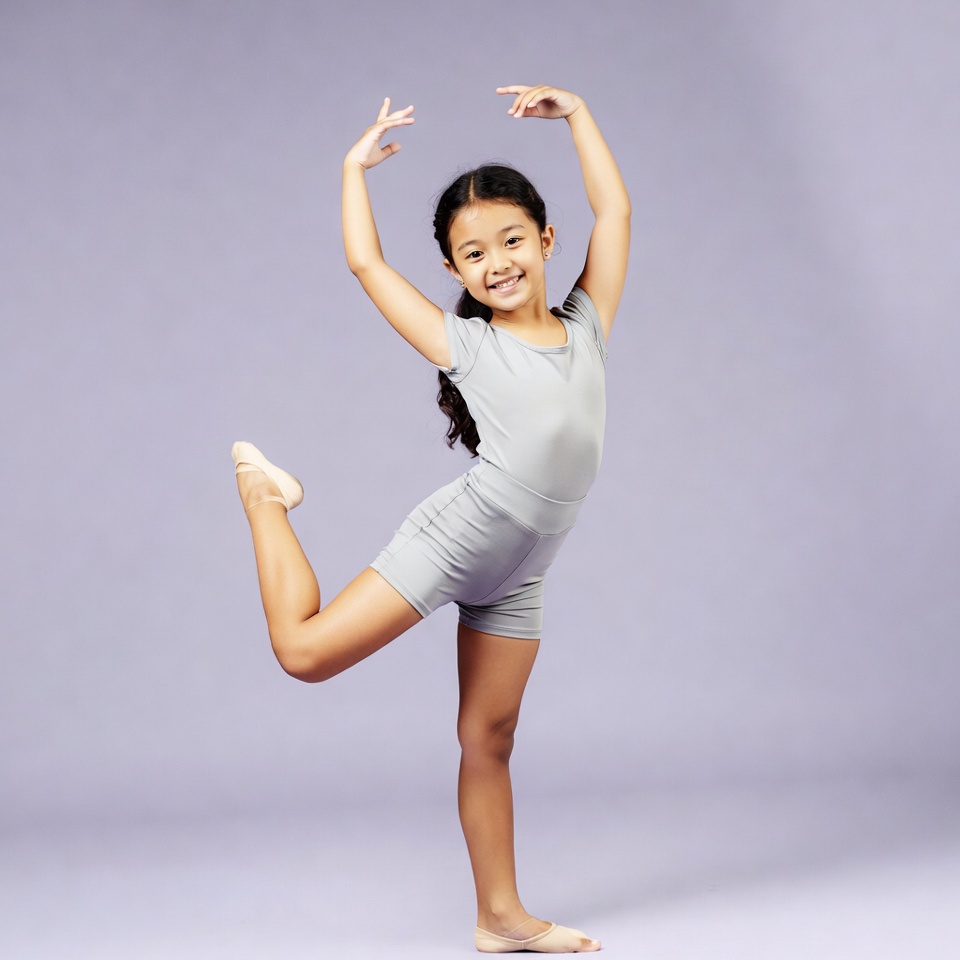 A young Asian girl with dark hair in a ponytail performs a ballet pose on a purple background. She wears a gray leotard and shorts with pink ballet slippers, raising both arms gracefully while lifting one leg high behind her. Her face shows a bright smile.