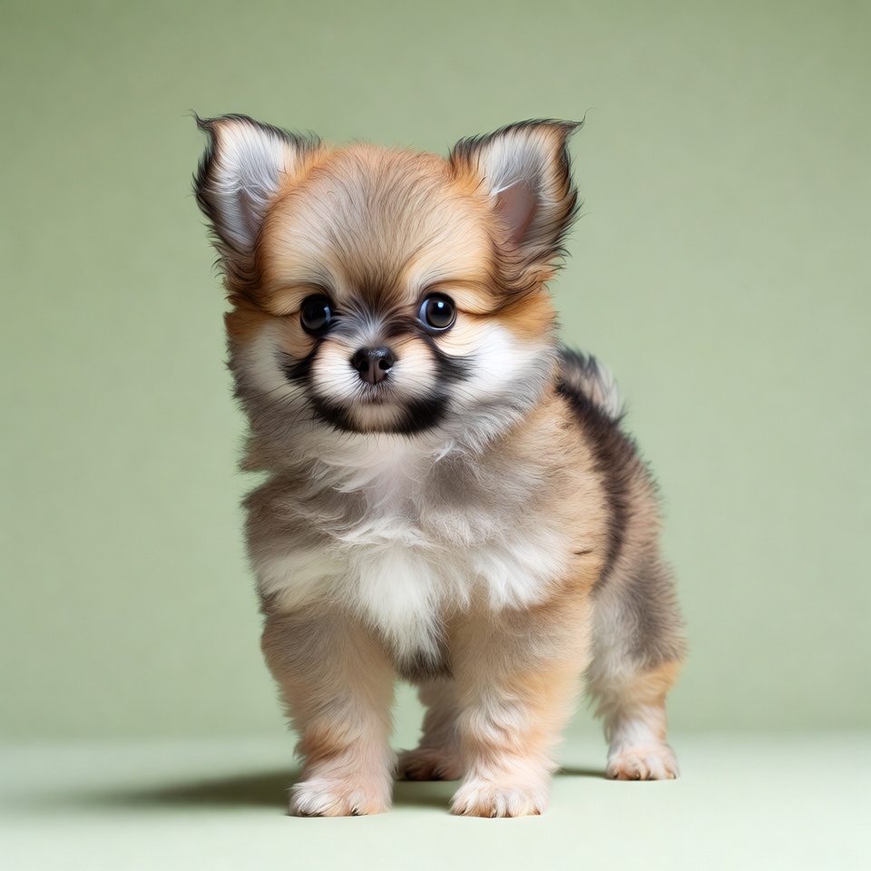 A fluffy Chihuahua puppy with tan and white fur stands on a solid green background. The puppy has large expressive eyes, perky ears, and a playful expression. Its fur is soft and detailed, highlighting its adorable features.