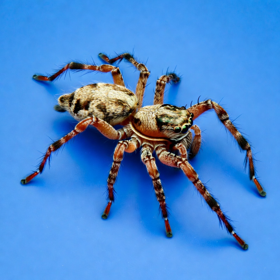 animal, arachnid, blue background, brown spider, eight legs, fangs, green markings, hairy spider, insect-like, isolated, jumping spider, legs, macro photography, pattern, tan spider, wolf spider, spider