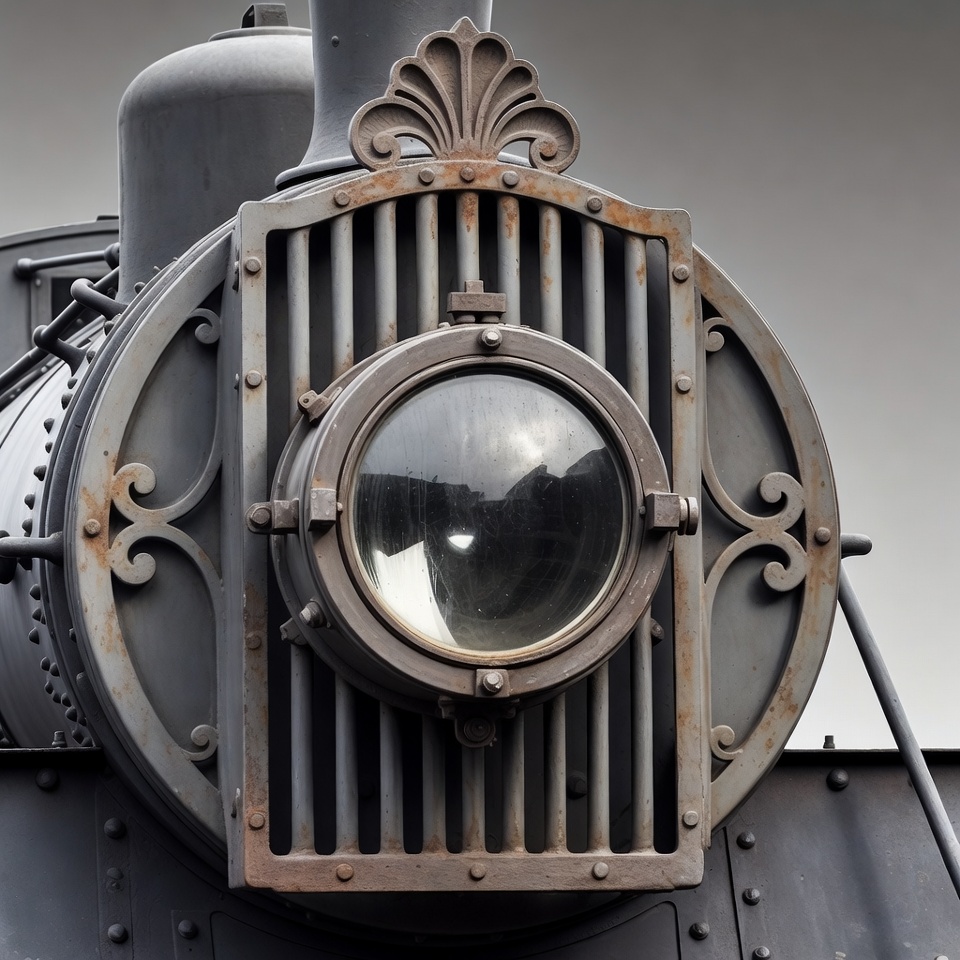 antique train, decorative flourishes, gray metal, headlight, isolated background, locomotive detail, metal grille, patina, rivets, round headlight, rust, steam engine, train front, vintage train, steam locomotive