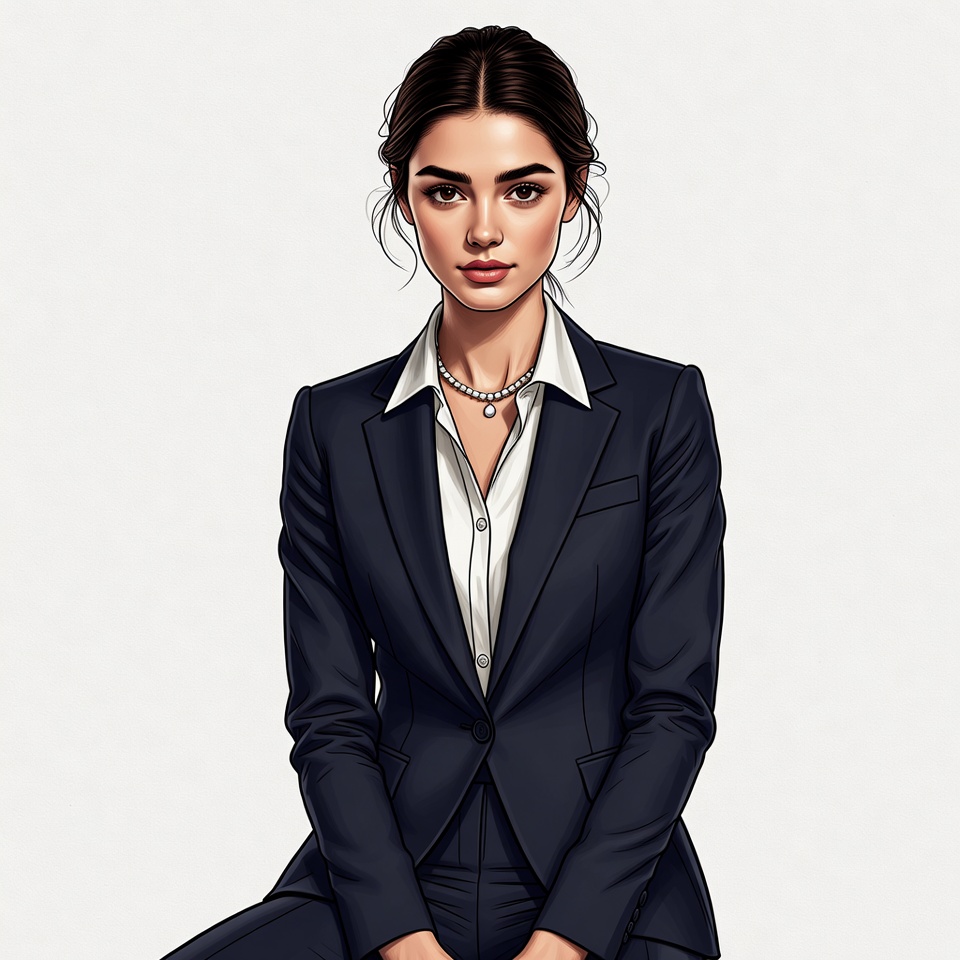 A young woman with dark brown hair styled in a loose bun poses confidently on a plain white background. She wears a tailored black suit jacket and pants with a white collared shirt underneath. A delicate pearl necklace adorns her neck, and her expression is poised and elegant.