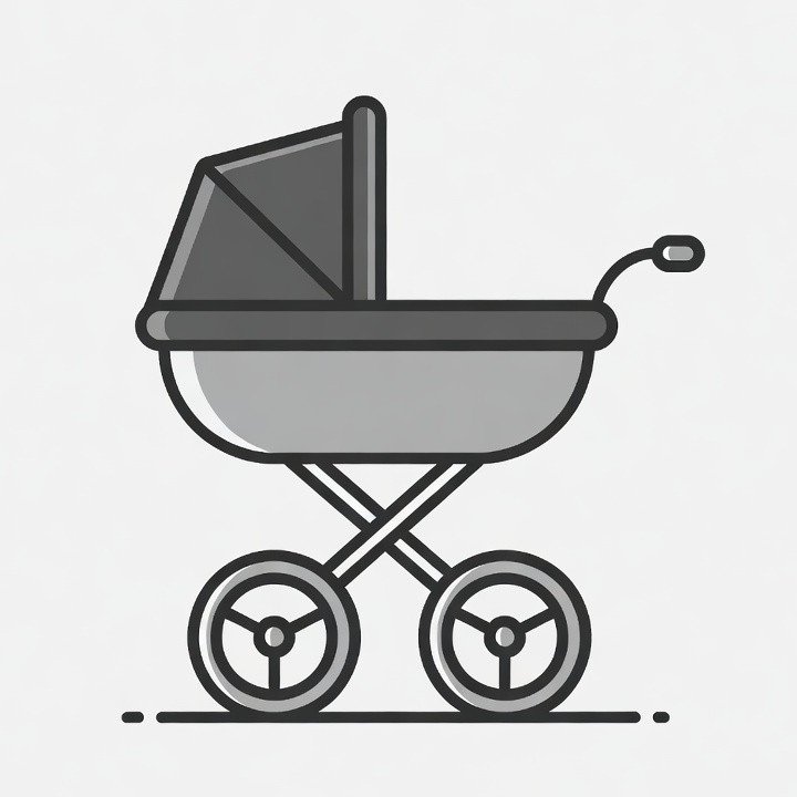 baby carriage, clipart, flat design, gray, handle, hood, illustration, isolated background, line art, pram, simple, stroller, vector, wheels, baby stroller