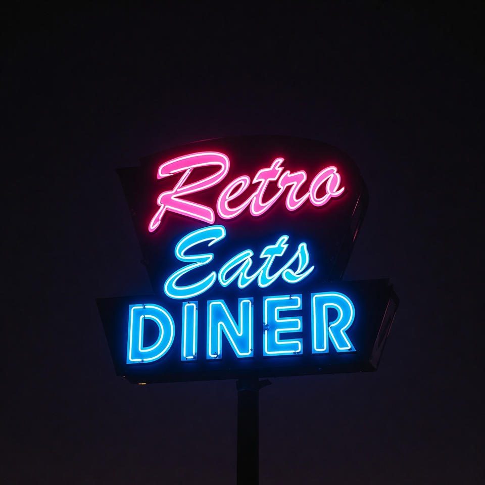 A glowing neon sign for Retro Eats Diner stands on a pole against a dark night sky. The sign features 'Retro' in pink neon above 'Eats' in pink and 'Diner' in blue neon. The vibrant lights create a classic retro diner appearance.
