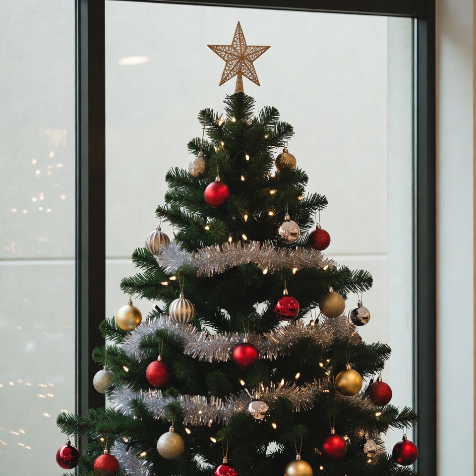 Christmas garland, Christmas lights, Christmas ornaments, decorated tree, festive tree, gold baubles, holiday decor, holiday tree, indoor decoration, modern window, pine tree, red ornaments, shiny baubles, silver tinsel, star topper, tree lights, white wall, window background, wooden star, Christmas tree