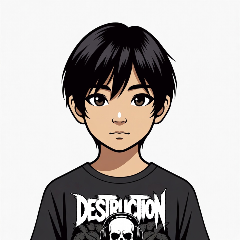 An anime-style illustration of a young boy with short black hair and large expressive eyes faces forward on a white background. He wears a black t-shirt featuring the band name 'DESTRUCTION' in bold white letters with a skull and headphones graphic surrounded by thorny designs. The illustration has clean black outlines and vibrant colors typical of manga art.