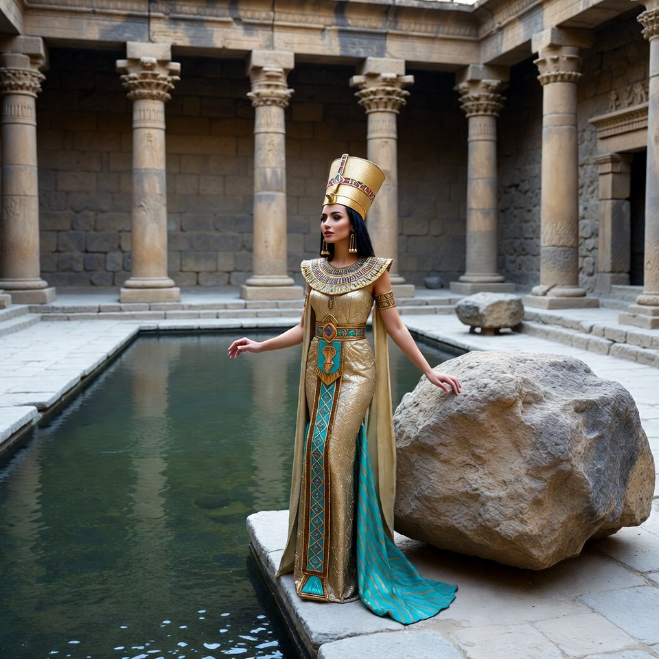 A woman dressed as Cleopatra stands gracefully beside a large rock near a pool in an ancient Egyptian temple courtyard. She wears an elaborate gold gown with turquoise accents, a tall headdress adorned with jewels, and traditional Egyptian jewelry. Tall stone columns surround the stone-paved area with water reflections.