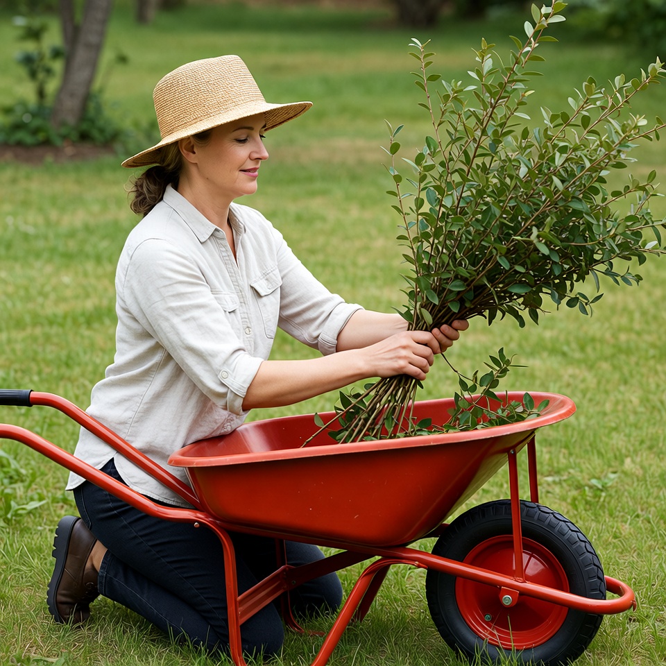 A woman with a ponytail and straw hat kneels on grass, loading a large bundle of green branches into a red wheelbarrow. She wears a light-colored button-up shirt and dark pants. The garden setting features trees and greenery in the background.