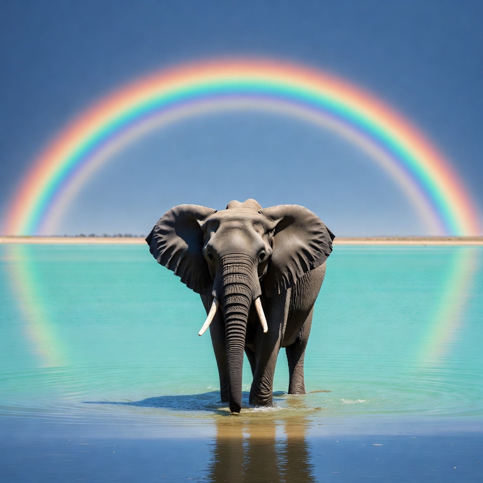 A large elephant stands in shallow turquoise water with a vibrant rainbow arching overhead. The background features a clear blue sky and distant horizon. The elephant's tusks and flapping ears are prominently visible.