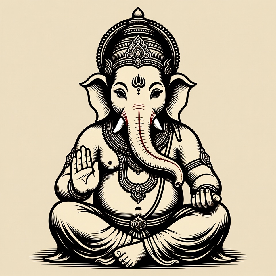 Ganapati, Hindu deity, Indian god, Lord Ganesha, beige background, blessing hand, clipart, crown, elephant god, elephant head, illustration, ink drawing, isolated background, jewelry, meditative pose, religious art, sitting Ganesha, trunk, tusks, Ganesha