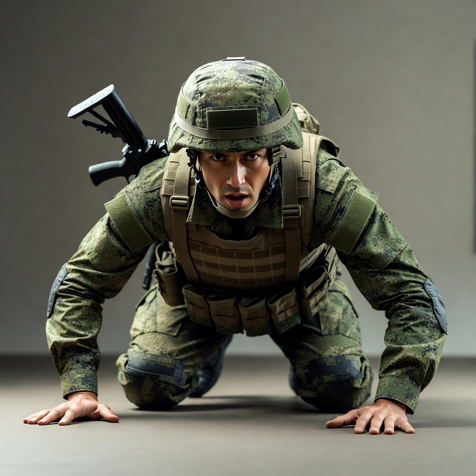 A male soldier in camouflage uniform and helmet kneels on the ground in a ready stance. He carries a slung assault rifle over his shoulder and wears tactical vest and gear. His expression is intense as he positions his hands forward on a plain gray background.