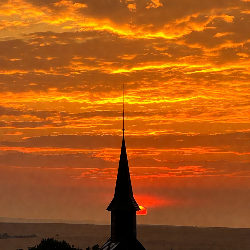 A tall church steeple with a cross stands in dark silhouette against a vibrant orange and yellow sunset sky filled with clouds. The sun appears as a glowing orb low on the horizon behind the structure. Distant trees are visible at the base in the hazy foreground.