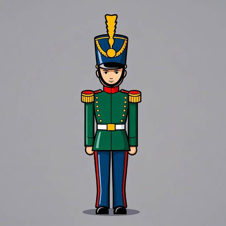 A cartoon nutcracker soldier stands on a gray background. He wears a green uniform with red pants, gold epaulettes, and a tall black shako hat topped with a yellow plume. His face is stern with a small mustache.