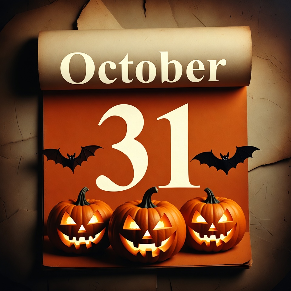 A vintage-style rolled paper calendar displays 'October 31' with the number 31 prominently featured. Three carved jack-o'-lantern pumpkins with glowing faces sit at the bottom, flanked by black bats. The background has a textured, cracked orange paper effect.