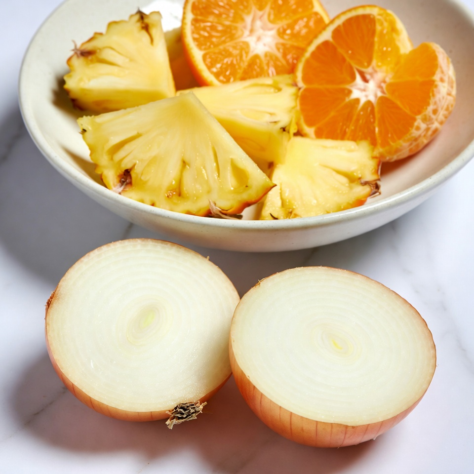 A white bowl contains sliced pineapple chunks and orange segments on a white surface. Sliced onions are arranged beside the bowl. The fruits and vegetables display vibrant colors and fresh textures.