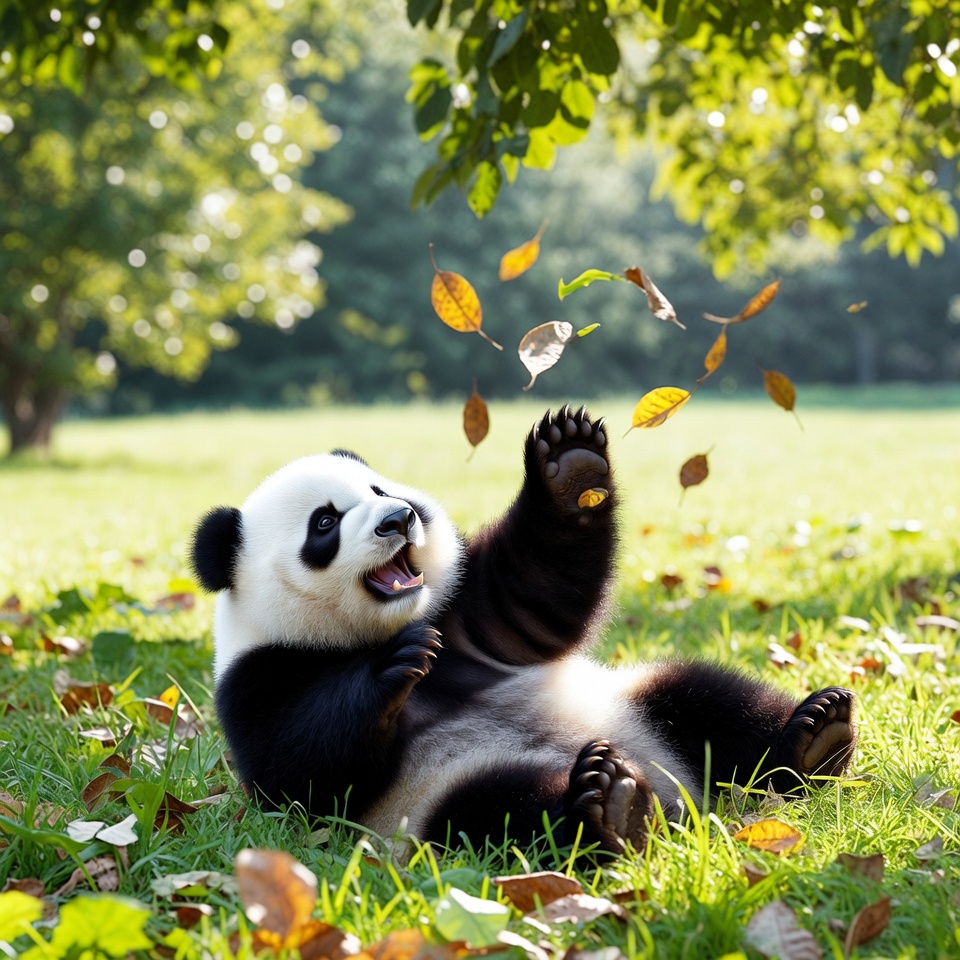 A cute baby panda lies on green grass in a sunny park, playfully catching falling autumn leaves with its paws. Surrounded by lush green trees and scattered leaves, the panda smiles with its mouth open and paws raised. The scene features vibrant foliage and a natural outdoor setting.