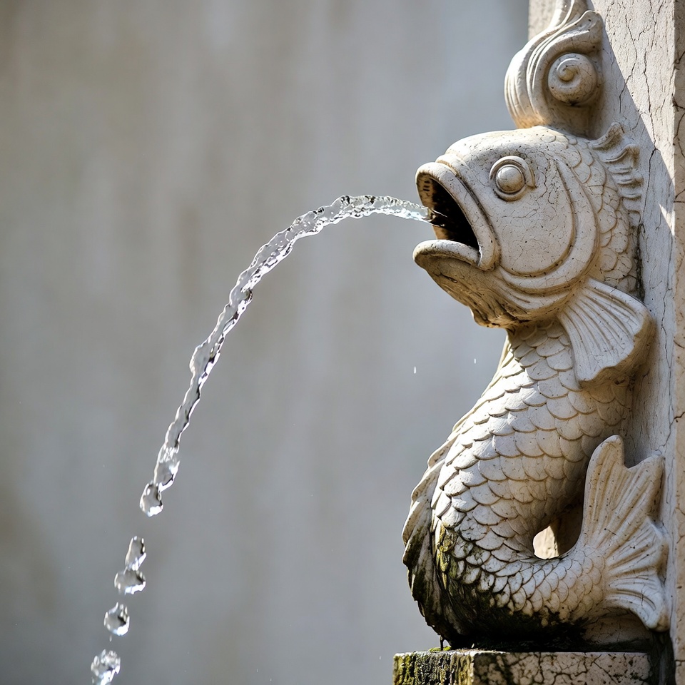 aquatic sculpture, architecture, carved fish, decorative fountain, fins, fish mouth, fountain head, outdoor fountain, scales, spouting water, stone sculpture, stone wall, wall fountain, water fountain, water stream, white stone, fish fountain