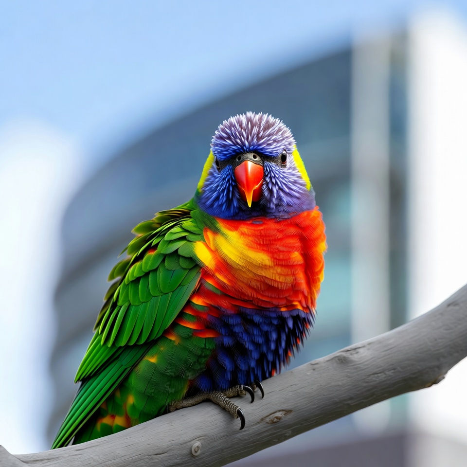 A vibrant rainbow lorikeet with multicolored feathers perches on a gray branch. The bird features a blue head, green wings, yellow chest, red belly, and a striking orange beak. A blurred modern building and blue sky form the background.