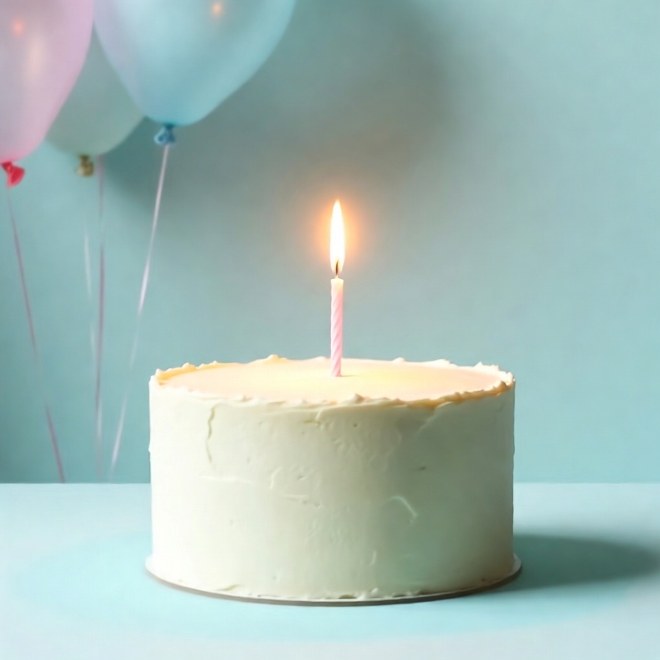 A white-frosted round birthday cake sits on a table with a single pink candle lit in the center. Pink and blue balloons float in the background against a light blue setting. The cake has smooth icing and is isolated on a plain surface.
