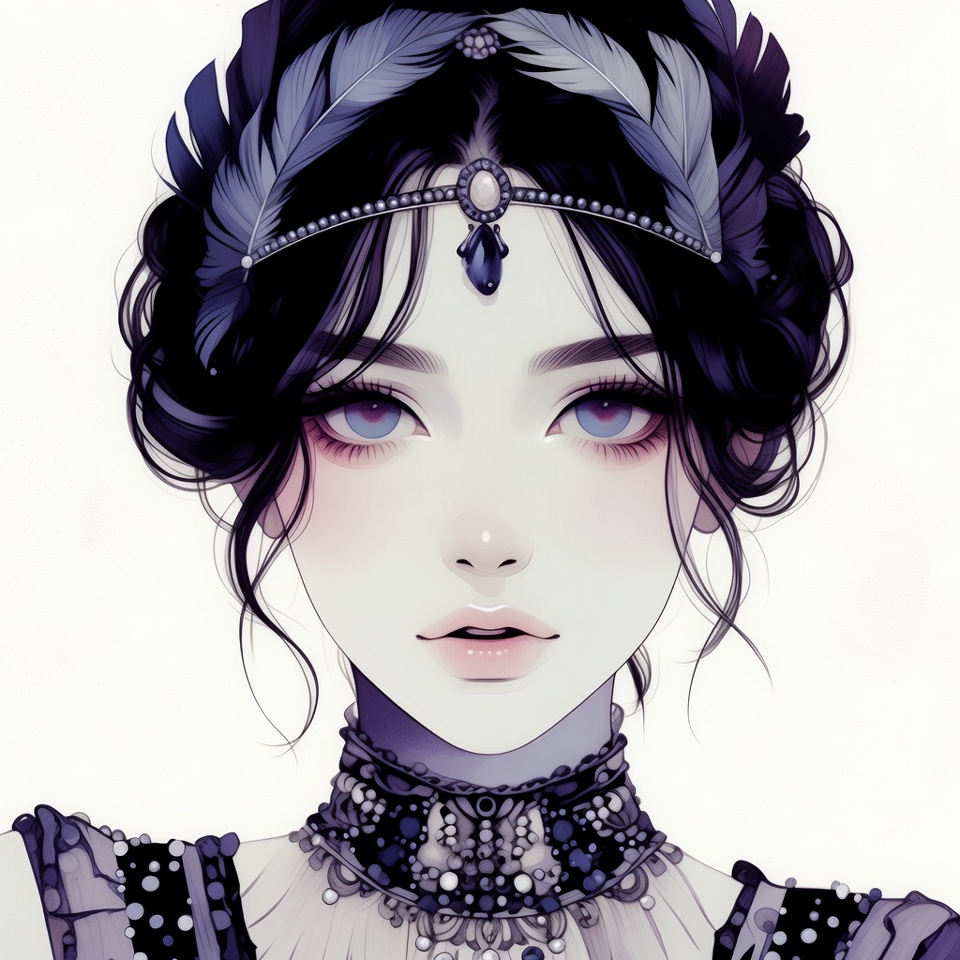 Asian, beaded necklace, beautiful woman, closeup, dark hair, digital art, fantasy portrait, feathered headdress, female, illustration, isolated background, jeweled headband, lace collar, pale skin, pastel colors, portrait, purple eyes, purple feathers, soft lighting, updo hairstyle, victorian fashion, anime girl