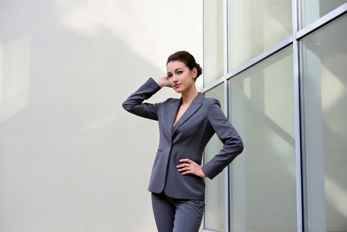 business attire, businesswoman, confident pose, corporate fashion, dark hair, female, glass windows, gray suit, hand on hip, isolated background, modern building, office attire, pantsuit, pose, professional, standing, stylish woman, touching ear, updo, woman