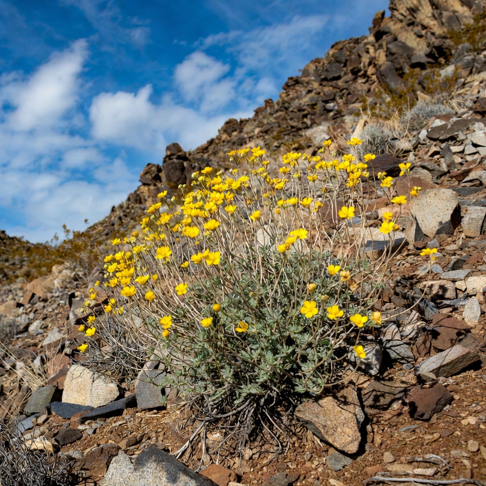 arid terrain, blue sky, boulders, clouds, desert flowers, dry landscape, flora, gray-green leaves, hillside, landscape, mountain slope, nature, outdoors, rocks, rocky slope, shrubs, sunny day, vegetation, wildflowers, yellow flowers
