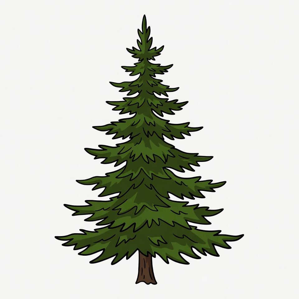 A cartoon-style illustration of a tall pine tree with dense green needle branches and a brown trunk. The tree stands centered on a plain white background. The design features layered branches tapering to a pointed top.