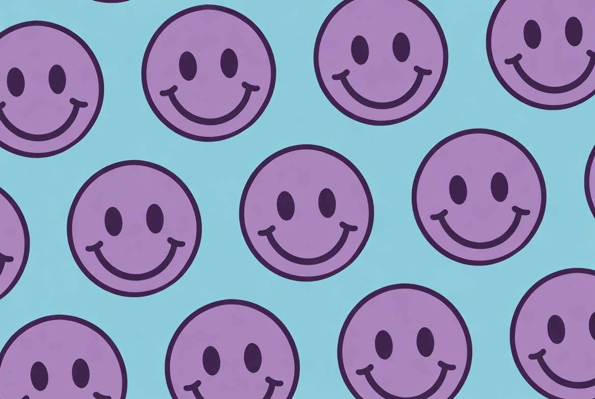 A seamless pattern features numerous purple smiley faces with black outlines on a light blue background. Each cartoon face has round eyes and a wide curved mouth expressing happiness. The faces are arranged in a repeating grid across the entire image.