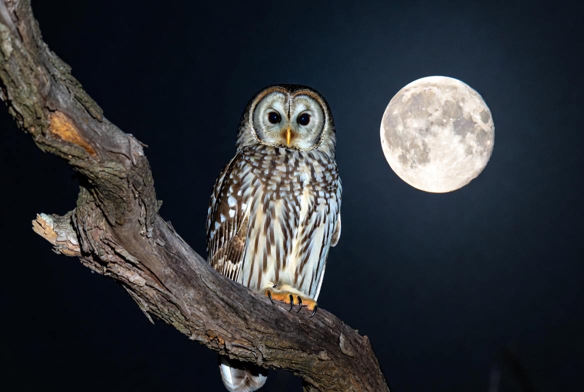Barred Owl Perched on Branch with Moon
