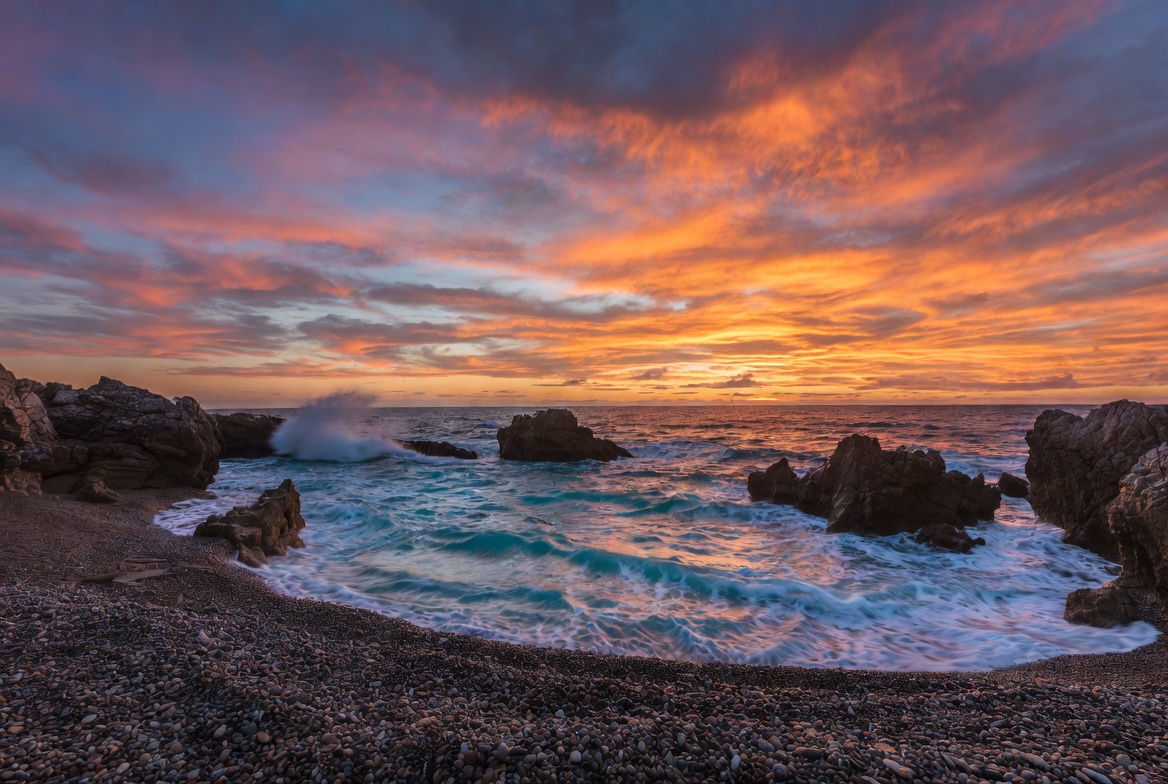 beach, clouds, coastline, crashing waves, dramatic sky, dusk, evening, horizon, landscape, nature, ocean, orange sky, pebbles, pink clouds, purple hues, rock formations, rocks, rocky shore, scenery, sea, seascape, shoreline, sky, turquoise water, vibrant colors, water, waves, sunset