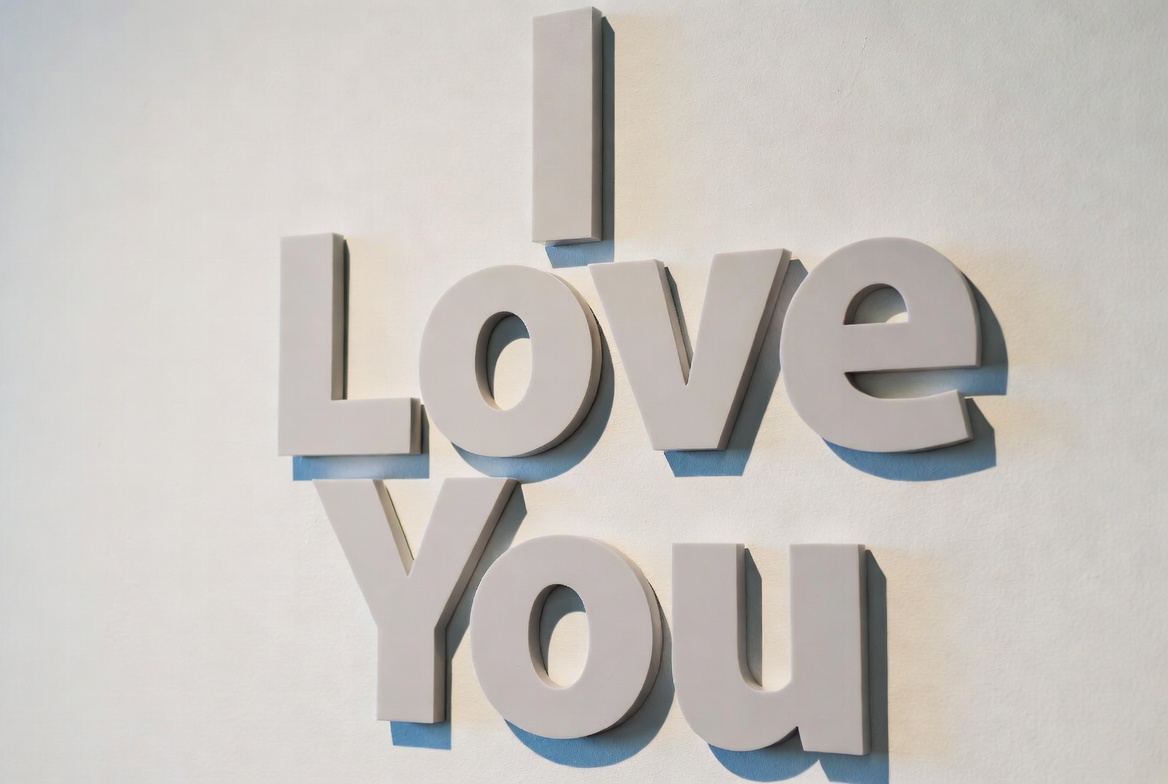 3D letters, Valentine's day, block letters, gray letters, isolated background, love letters, raised letters, romantic message, sculpture, shadows, text art, typography, wall art, white wall, I love you