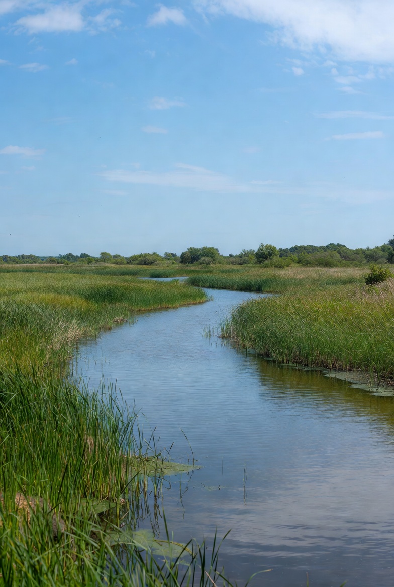 A serene river winds through tall green reeds and marshland under a clear blue sky with scattered clouds. Lily pads float on the calm water surface, surrounded by lush vegetation and distant trees. The landscape features vibrant green grasses and a peaceful waterway.
