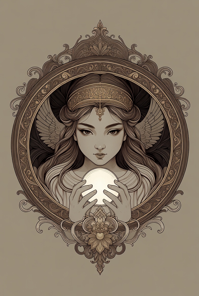 angel wings, art nouveau, beige background, crystal ball, decorative border, ethereal, fantasy art, female, floral motifs, glowing orb, headpiece, illustration, isolated background, line art, long hair, mystical, ornate frame, portrait, vintage style, woman