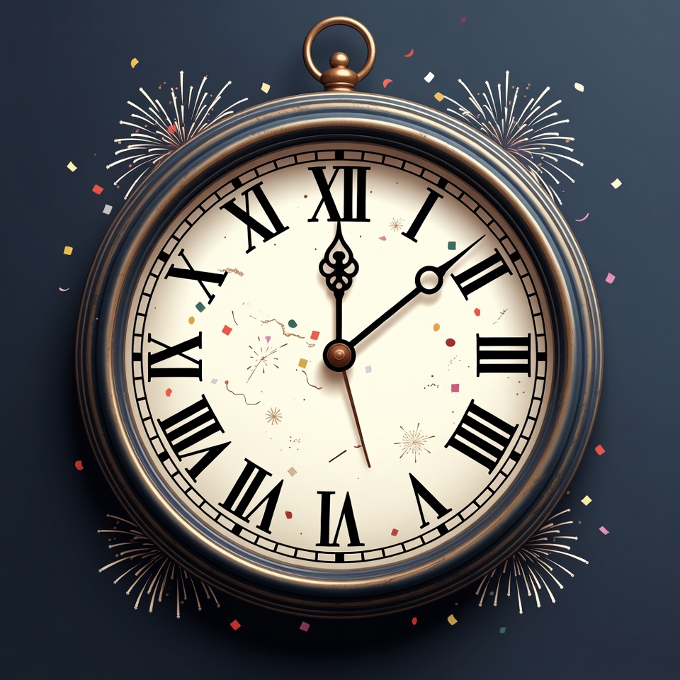 A vintage-style brass clock with Roman numerals shows midnight on a dark blue background. Colorful confetti and fireworks explode around it, with hands pointing to 12:00. The design features a detailed face and ornate edges.