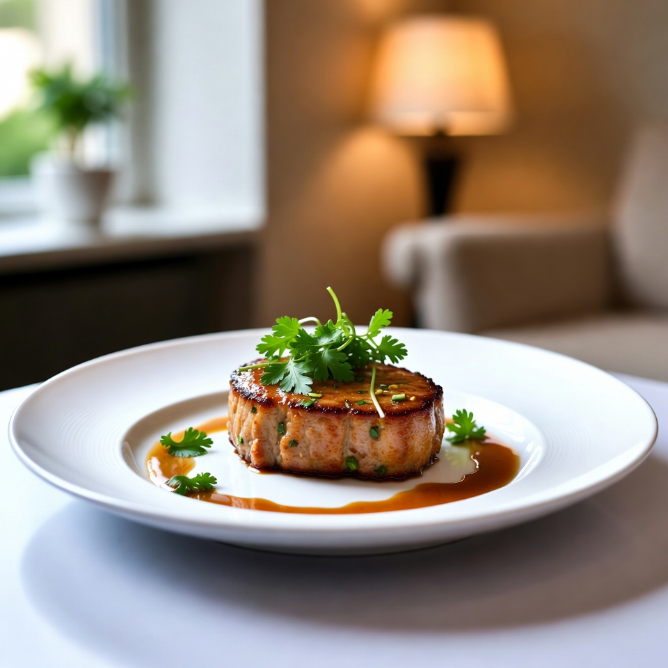 beef medallion, beige armchair, blurred background, cilantro garnish, dinner entree, fine dining, food plating, gourmet dish, herb topping, indoor plants, kitchen table, lamp light, meat dish, plated food, sauce drizzle, savory meal, seared meat, white plate, window view, pork tenderloin