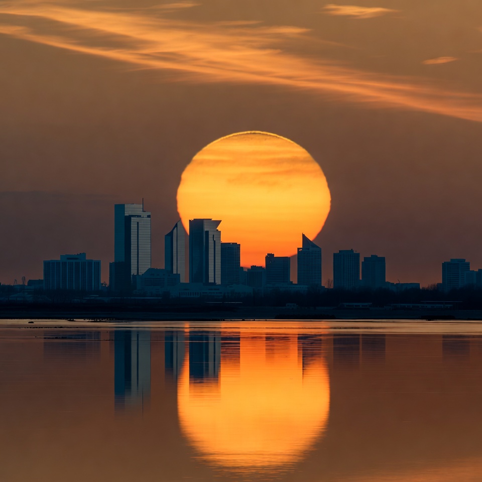 city skyline, cityscape, clouds, dusk, evening sky, golden hour, horizon, mirrored skyline, modern buildings, orange sky, orange sun, reflection, serene water, skyscrapers, sun reflection, tall buildings, urban landscape, water reflection, waterfront, sunset
