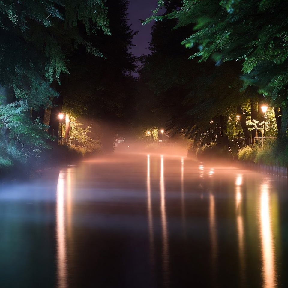 A narrow path lined with tall trees runs alongside a calm canal shrouded in thick fog at night. Street lamps cast warm orange glows through the mist, reflecting on the water's surface. The scene features dense foliage and a serene, misty atmosphere under a dark sky.