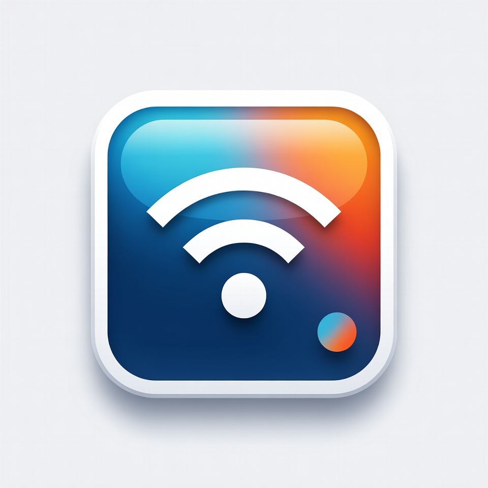 A glossy square icon features a white WiFi signal symbol with three curved arcs. The background gradients from blue to orange with subtle blue and red dots at the bottom. It has a shiny, glass-like effect on an isolated white background.