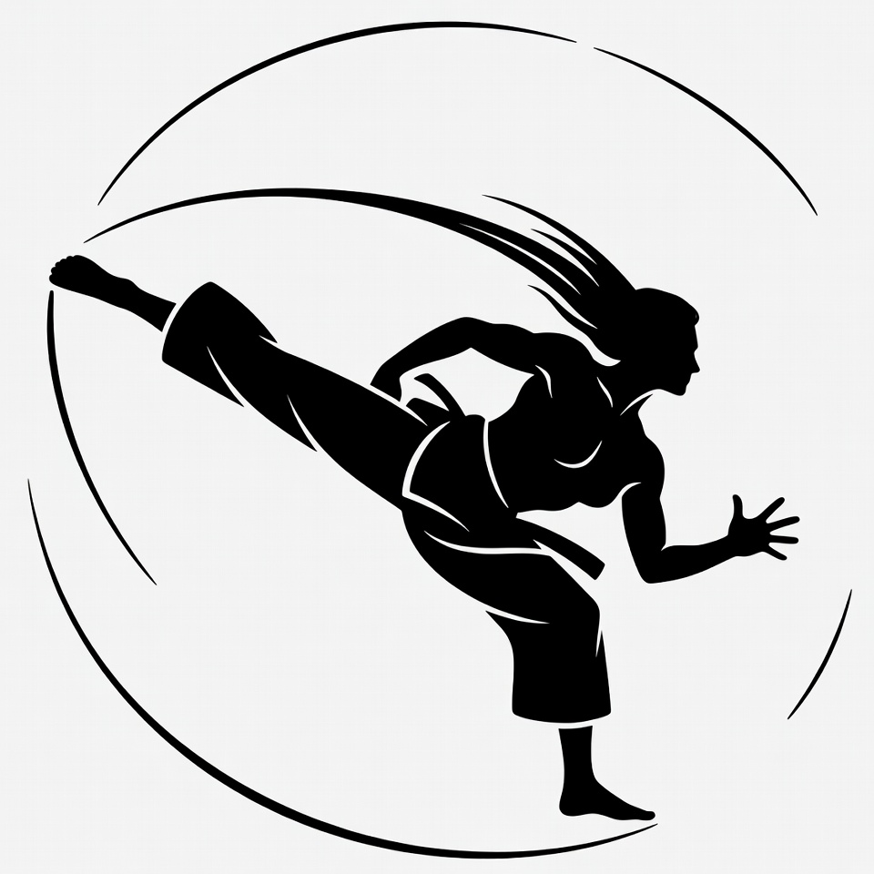 A black silhouette illustration of a woman performing a high karate kick inside a circular frame. She wears a traditional gi uniform with flowing ponytail hair, captured in dynamic motion with one leg extended and arms outstretched. The design features bold outlines on a white background.