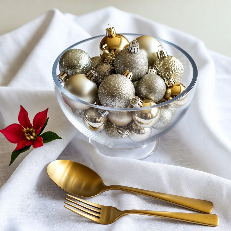 A clear glass bowl overflows with shiny gold and silver Christmas ornaments on a white tablecloth. A red poinsettia flower sits beside the bowl, adding a festive touch. Two gold utensils, a spoon and fork, are placed nearby on the white fabric.