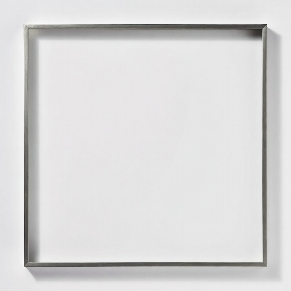 A sleek silver picture frame with a thin metallic border sits on a plain white background. The frame encloses a completely empty white space. It is isolated and ready for artwork or photos.