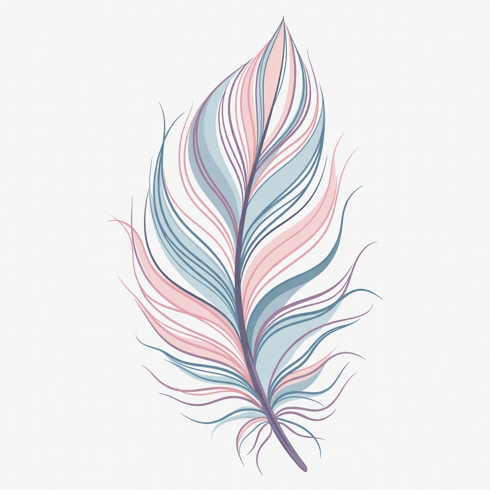 A detailed vector illustration of a single feather on a white background. The feather features soft pink, blue, and purple hues with flowing, curved lines forming its delicate structure. It is isolated and stylized for graphic design use.