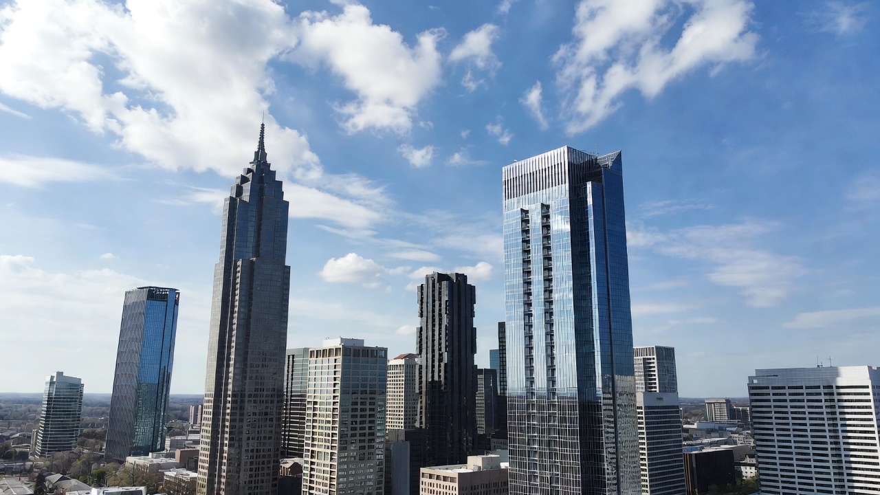 aerial view, architecture, blue sky, cityscape, daytime sky, downtown, glass buildings, high-rise buildings, metropolis, modern buildings, skyscrapers, steel towers, tall buildings, urban landscape, white clouds, city skyline