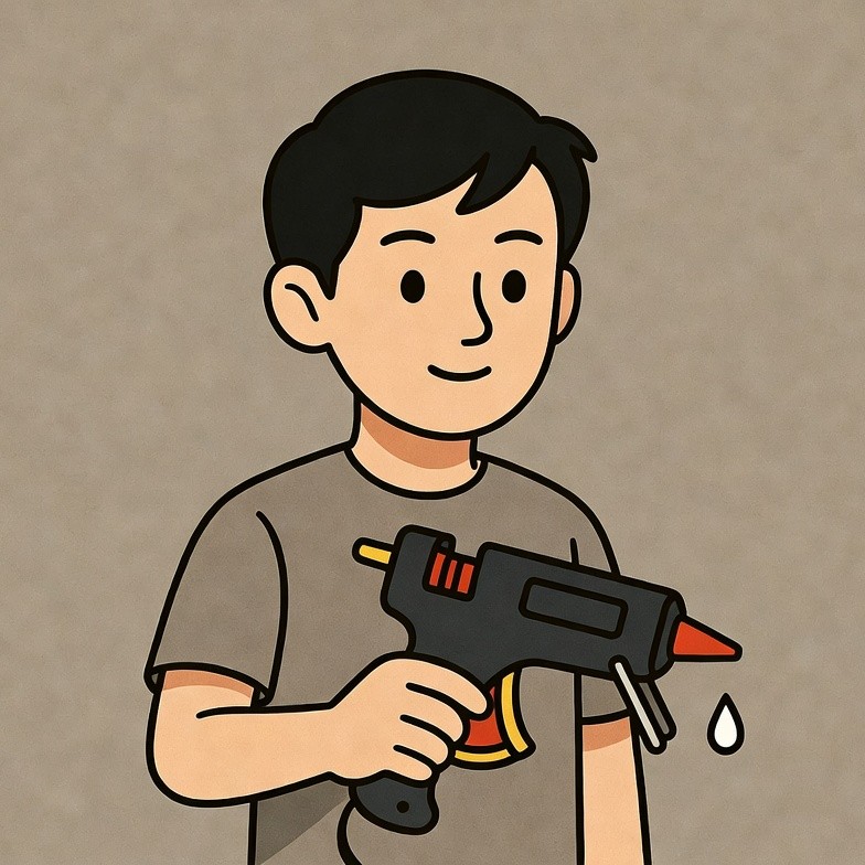 A cartoon Asian boy with short black hair smiles while holding a black hot glue gun with a red trigger and dripping glue. He wears a gray t-shirt and stands against a plain beige background. The illustration features simple bold lines and expressive facial features.