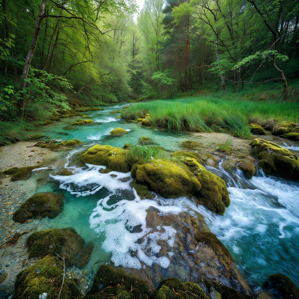 branches, cascade, clear water, emerald river, environment, ferns, flowing water, foliage, forest, grass, green trees, landscape, lush greenery, mossy rocks, nature, outdoors, pebbles, riverbank, rocks, scenic, spring forest, stream, turquoise water, verdant, white foam, wilderness, woodland, river