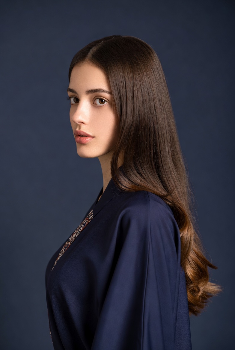 almond eyes, beautiful woman, brown hair, dark background, dark hair, embroidered kimono, female, full lips, long hair, navy blue kimono, portrait, profile view, serene expression, side profile, silk robe, wavy hair, young woman, woman