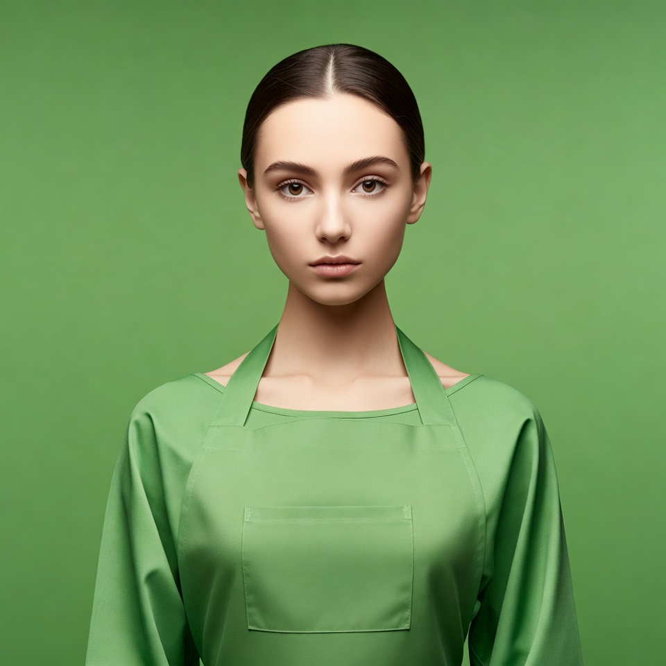 White, apron, clothing, dark hair, fashion, female, green apron, green background, isolated background, ponytail, portrait, studio photo, young woman, woman