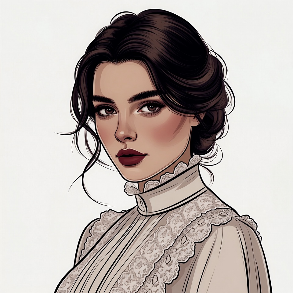A digital illustration of a young woman with dark brown hair styled in an elegant updo. She has striking features with flushed cheeks, dark expressive eyes, and red lips, gazing forward. She wears a white high-collared blouse adorned with intricate lace details.