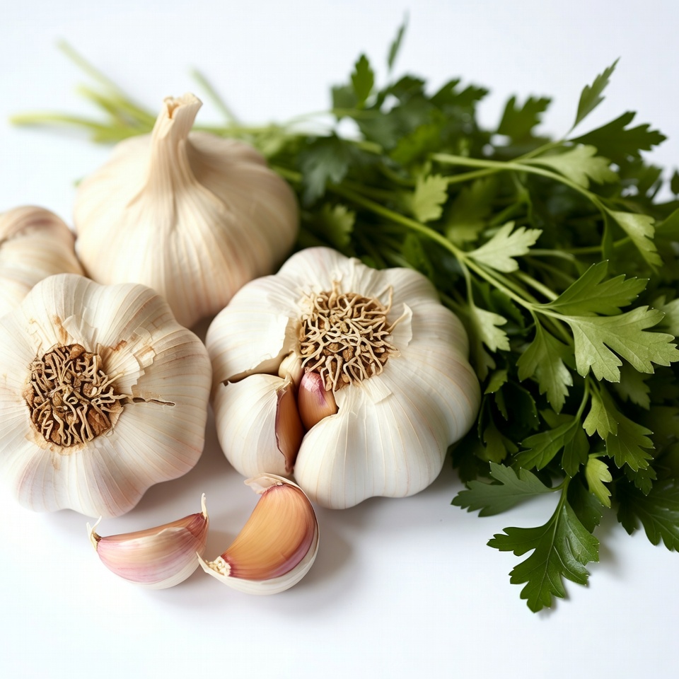 Several whole garlic bulbs and peeled cloves are arranged on a white background. Fresh green parsley sprigs surround the garlic, adding color and contrast. Some cloves are split open, revealing the pinkish interior.